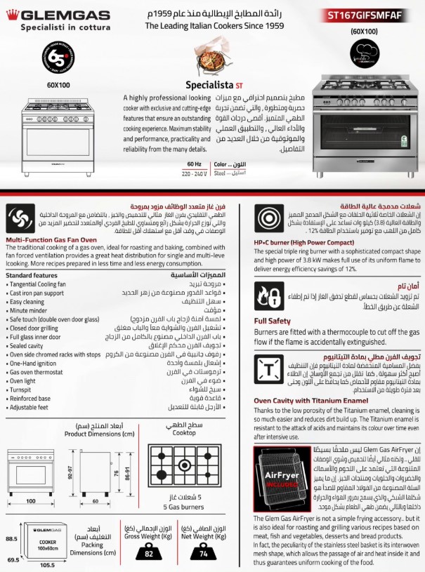 مطبخ جليم غاز 60*100 امان تام متعدد مقلاة هوائية استيل - ST167GIFSMFAF
