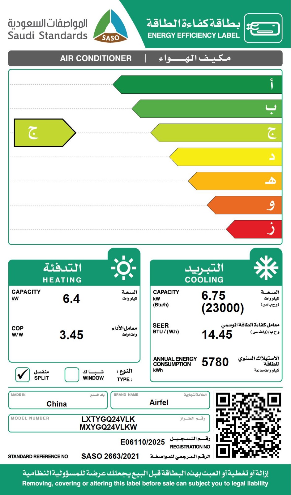 مكيف ايرفيل - سبيلت جداري - فريون - 410انفرتر - واي فاي 24حار / بارد - LXTYGQ24VLK - MXYGQ24VLKW