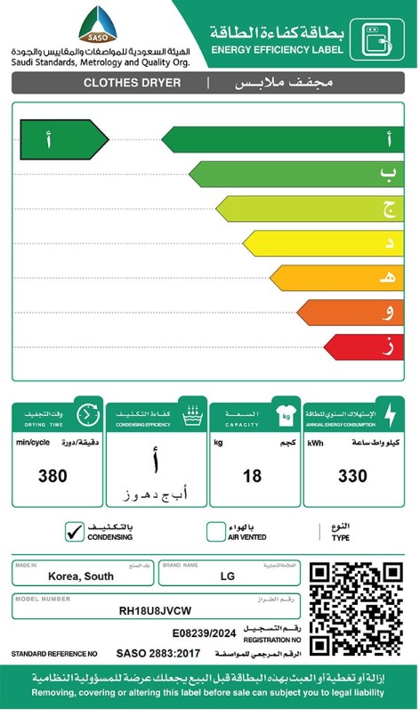 نشاف ال جي مكثف 18 كيلو مستشعر تجفيف ThinQ استيل اسود كفاءة أ - RH18U8JVCW