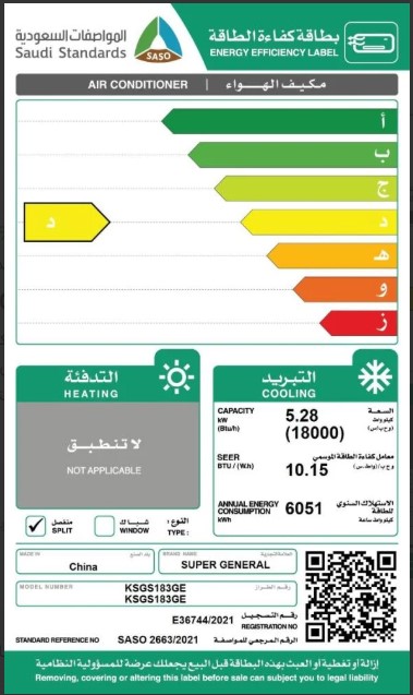 مكيف اسبيلت سوبر جنرال 18 بارد سعة تبريد 18000 - KSGS183GE1