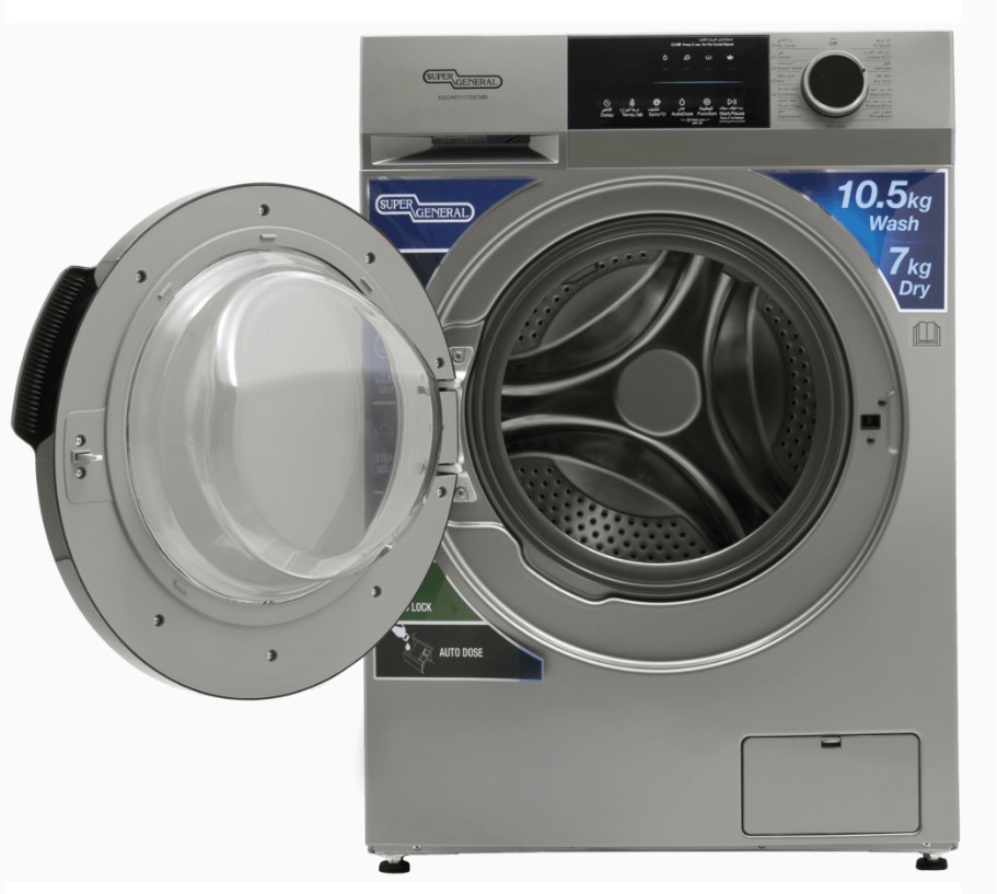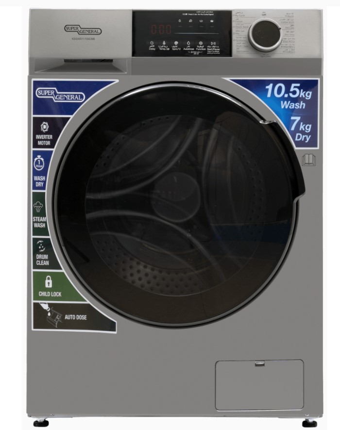 سوبر جنرال غسالة اتوماتيك امامية، سعة 10.5 كجم، تنشيف 100%، تنشيف 7 كجم ، 15 برنامج، سيلفر - KSGWD11700CMB