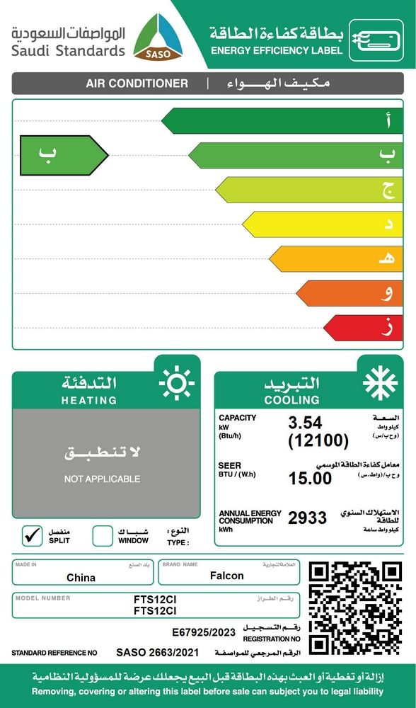 مكيف اسبليت فالكون سعة التبريد 12100وحدة (انفرتر) FTS12CI
