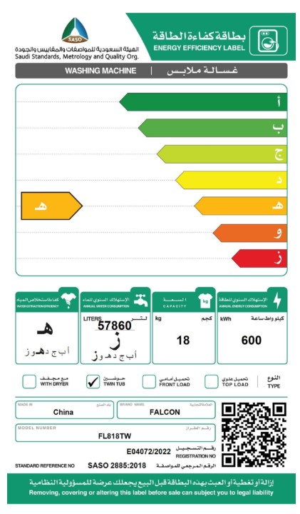 غسالة حوضين فالكون 18 كيلو أبيض - FL818TW