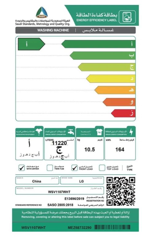 غسالة ال جي اتوماتيك امامية كومبو تنشيف 100% 8 كيلو غسيل 5 كيلو تنشيف ابيض كفاءة أ